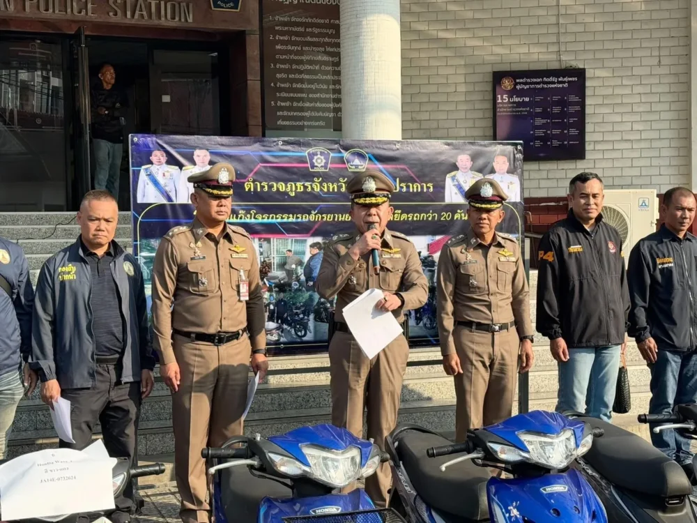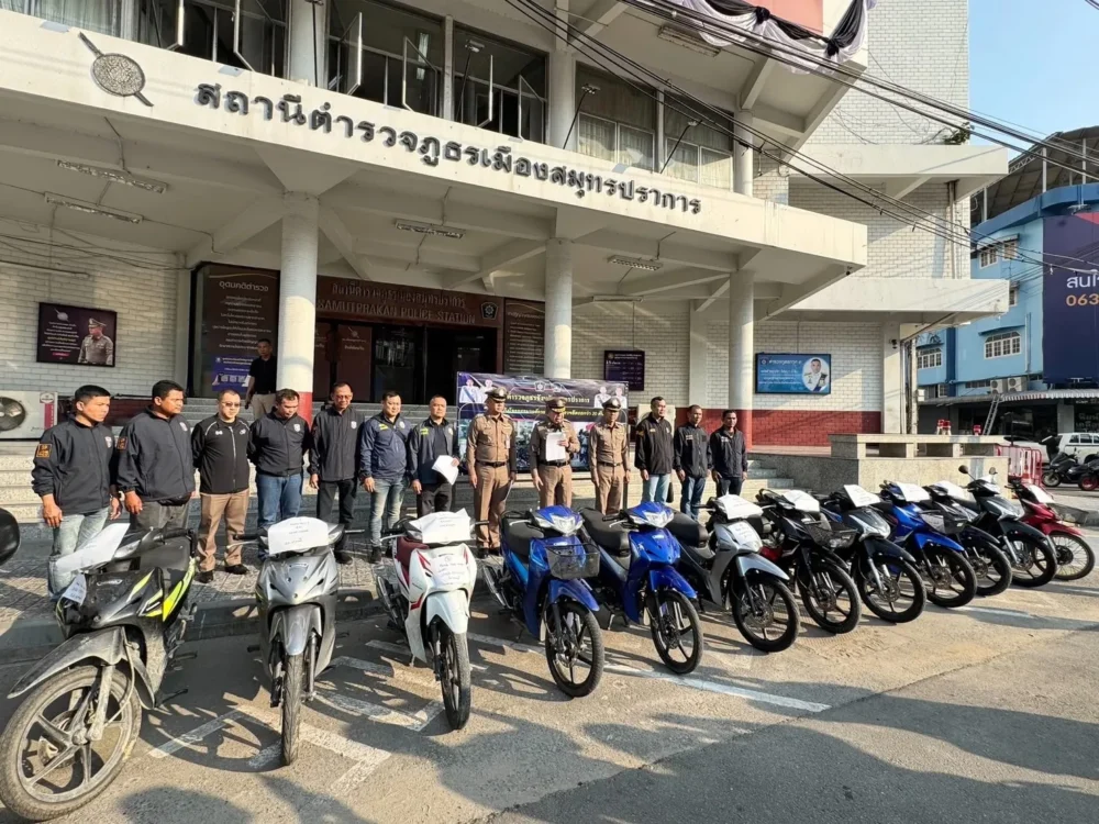 วันที่ 2 ธันวาคม 2568 พล.ต.ต.ภูมินทร์ สิงหสุต ผบก.ภ.จว.สมุทรปราการ เปิดยุทธการกวาดล้างเครือข่ายโจรกรรมรถจักรยานยนต์รายใหญ่ สนธิกำลังทุกโรงพักในพื้นที่ หลังได้รับเบาะแสสำคัญจากพลเมืองดี จนนำไปสู่การจับกุมผู้ต้องหารวม 8 ราย ในจำนวนนี้เป็นเยาวชน 3 ราย พร้อมยึดรถของกลางรวม 20 คัน และรถตู้ลำเลียงอีก 1 คัน